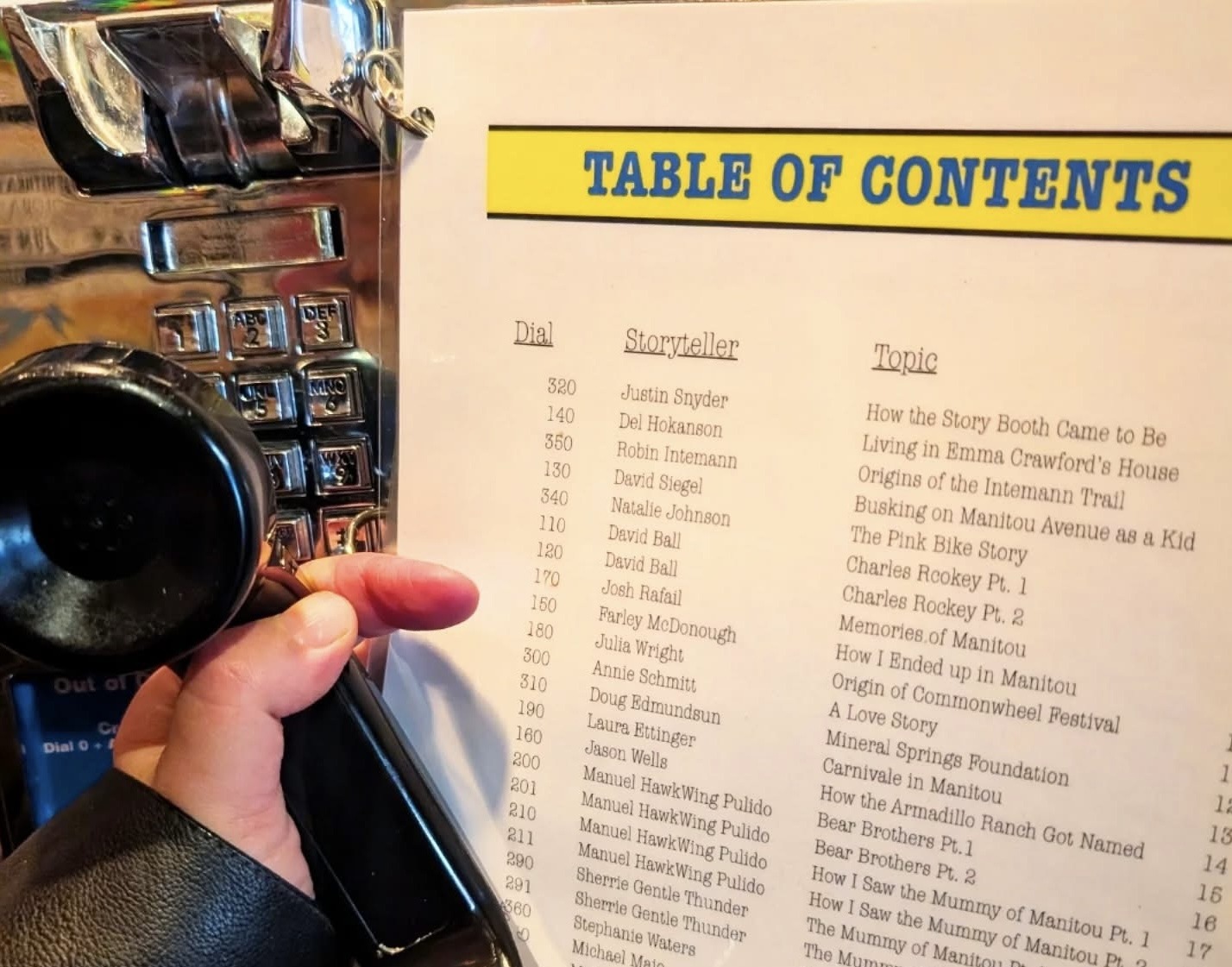 The phone book in this booth is a table of contents with the names of storytellers, story topics and their “phone numbers.”