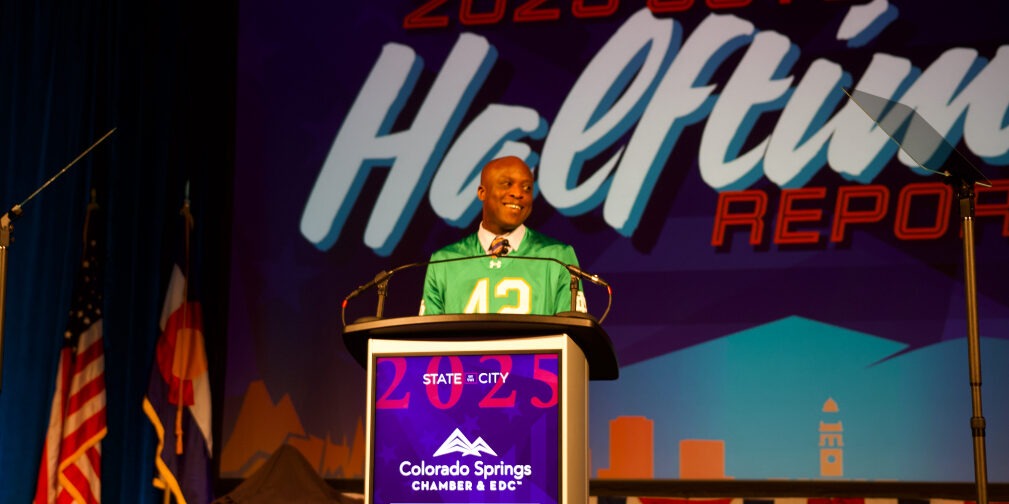 “Halftime is when coaches and analysts will step back and look at the first half,” said Mobolade, wearing a Notre Dame football jersey. “They review key plays and stats and strategies, and then make adjustments needed to finish strong. And just like every football game, I also recently passed my halfway mark of my first term as new mayor. Today I stand before you to give you my halftime report. Look at the stats, key plays, and strategy as we work together to advance the flourishing of Colorado Springs.”